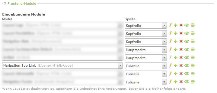Gehen Sie als nächstes im Backend-Modulen über Layout > Themes > Ihr Theme > Seitenlayouts zum Seitenlayout und binden Sie dort das angelegte Modul unter „Frontend-Module“ > „Eingebundene Module“ in der Fußzeile Ihres Layouts ein.