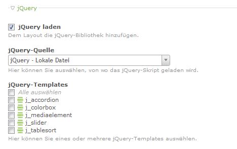 Ebenfalls in dem Seitenlayout aktivieren Sie die jQuery-Funktionen. Dazu setzen Sie unter „jQuery“ den Haken bei „jQuery laden“ und wählen eine Quelle für die jQuery aus.