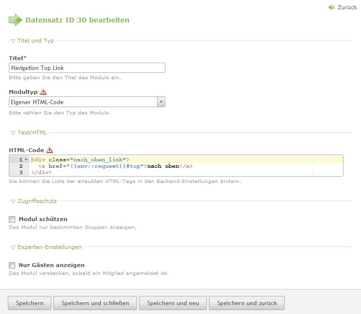 Um Ihren Top-Link Button über eine externe CSS-Stylesheet optisch anzupassen, vergeben Sie die Klasse nach_oben_link. Darüber können Sie dann den DIV-Container gezielt ansprechen.
